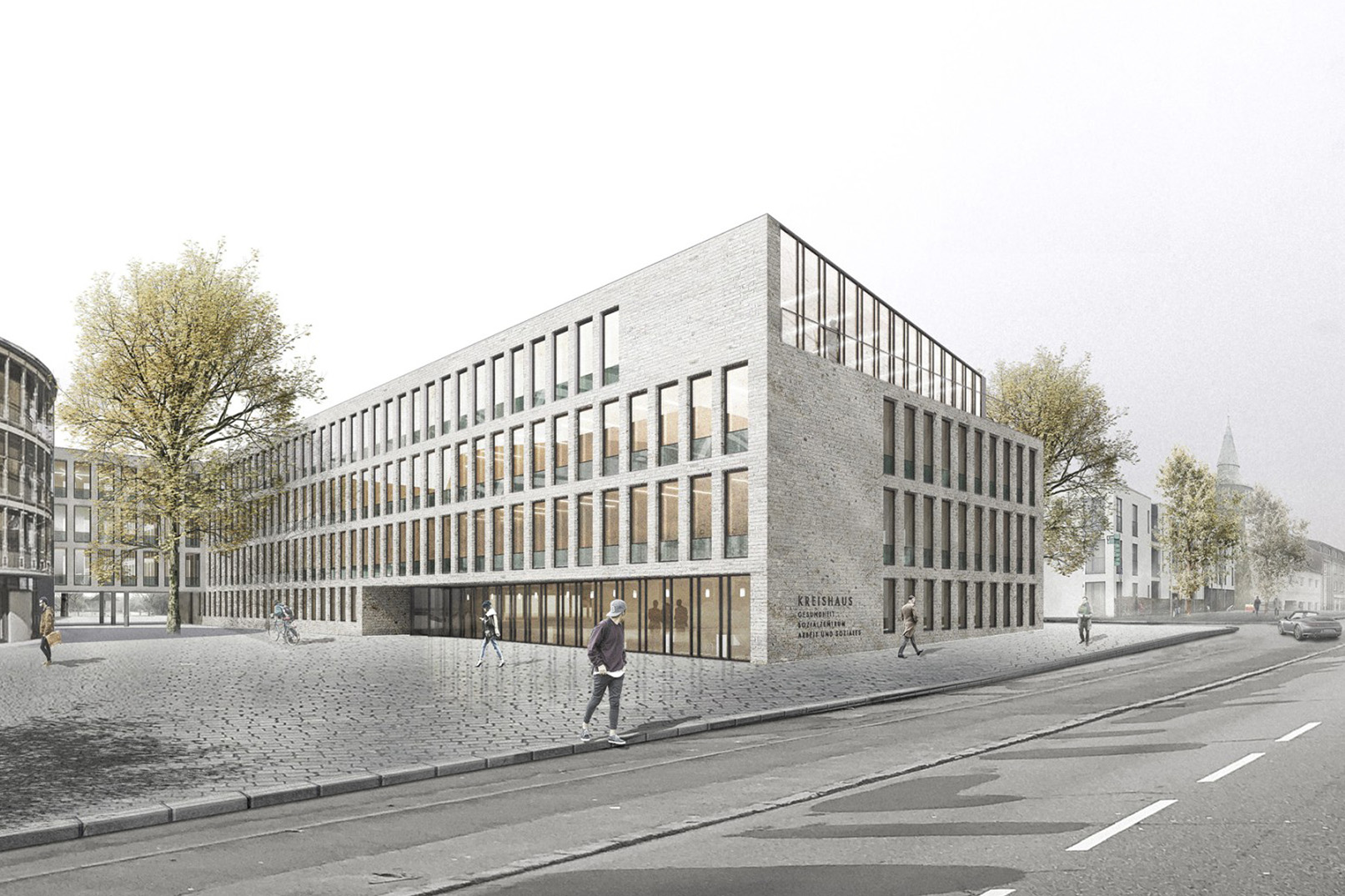 Im Wettbewerb zur Erweiterung des Kreishauses Nordfriesland in Husum wurde der Entwurf von Winking · Froh Architekten mit dem ersten Preis ausgezeichnet. Der Neubau erweitert die Büronutzungen auf drei Ebenen, schafft klare Raumkanten zum Campuspark und einen städtischen Platz an der Marktstraße. Das Erdgeschoss öffnet sich großzügig und verbindet den Grünzug mit dem Eingangsbereich.